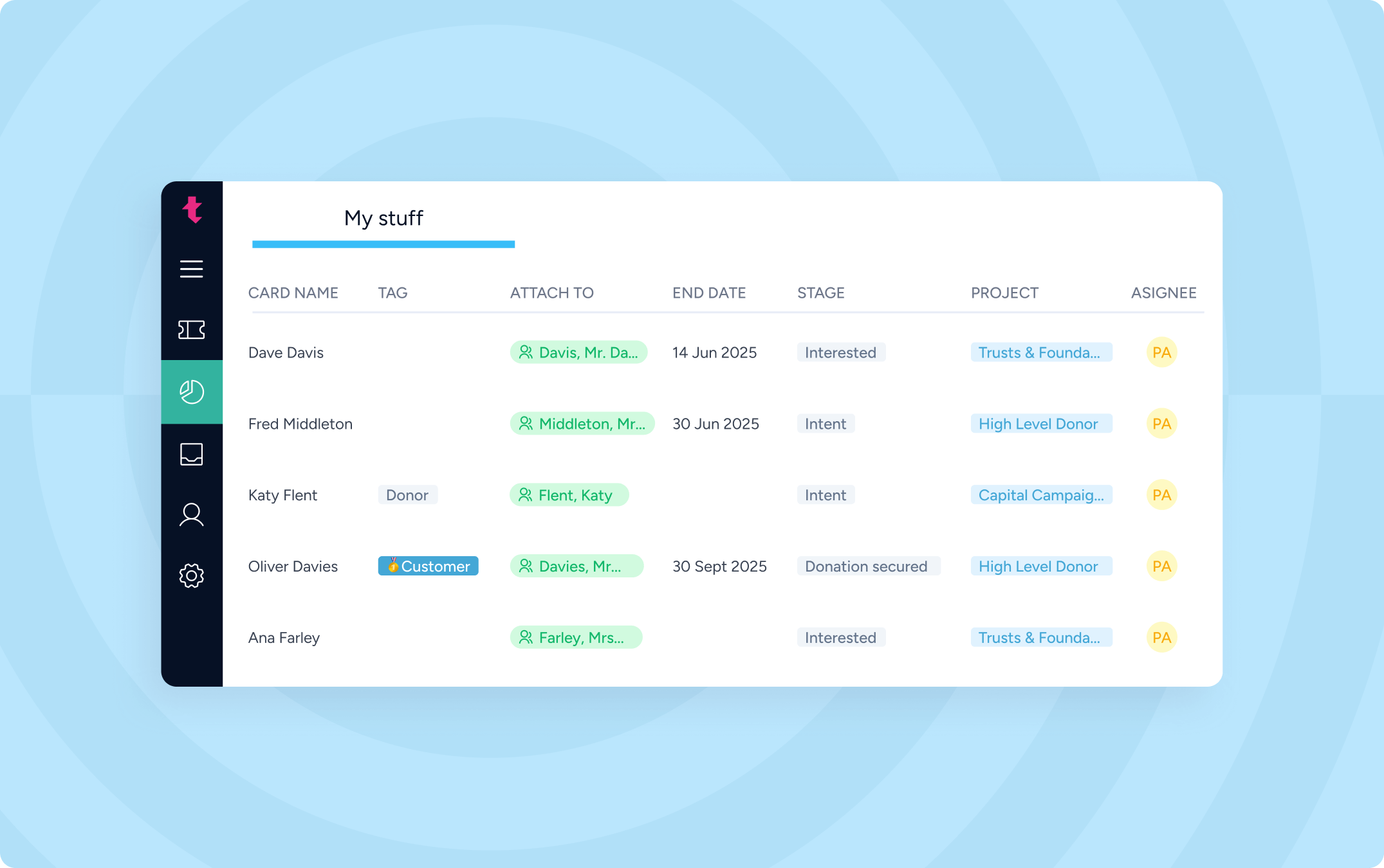 Link project cards to customers, orders, events, and shows so operational work always sits in the right context.